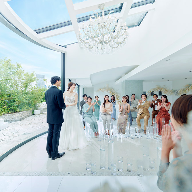 目の前に広がる空と緑が、まるでガーデンにいるような心地にさせてくれる一面ガラス張りのチャペル。天窓から降り注ぐ光が大理石のバージンロードや純白の空間に反射して、キラキラした光に包まれます。クリアな椅子をアーチ状に配し、みんなに見守られるアットホームなセレモニーのひとときを。