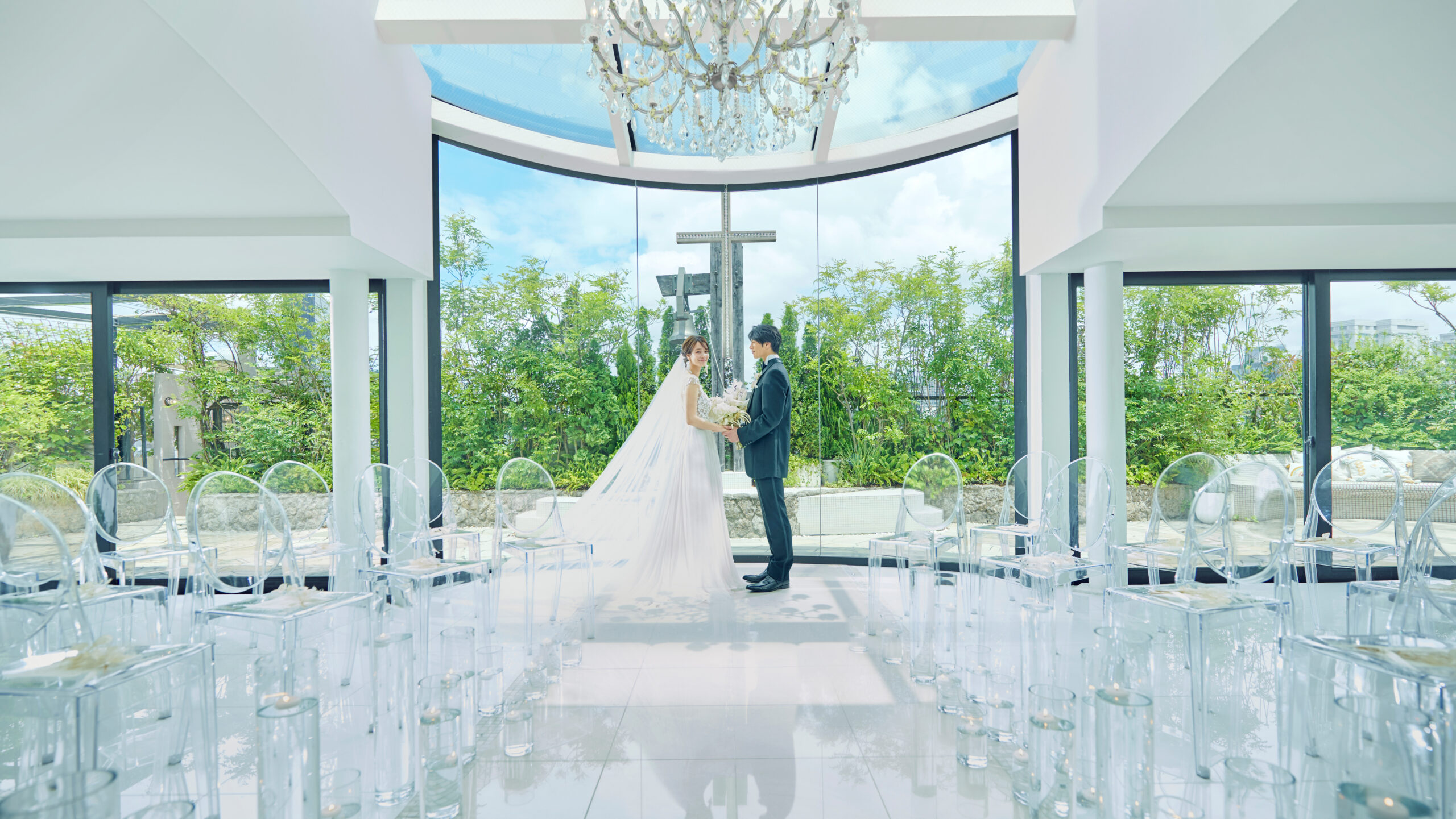 *一面ガラス張りの透明感あるアトリウムチャペル
